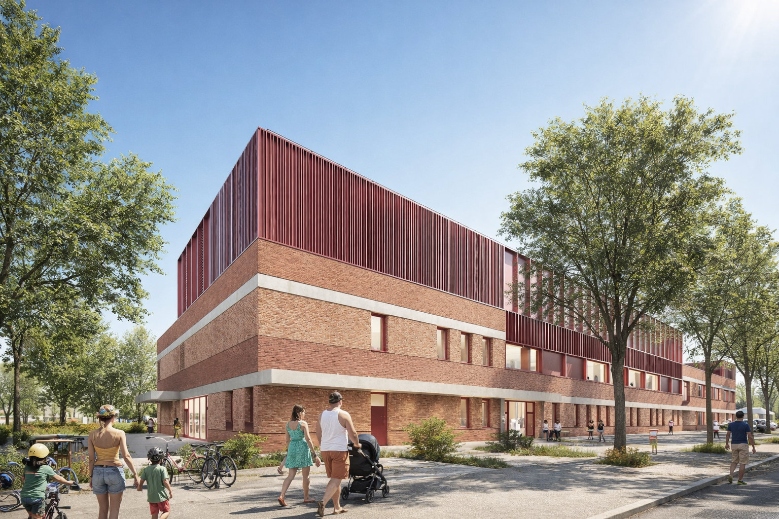 Die neue zweizügige Grundschule Friedensstraße in Köln-Porz umfasst eine Zweifachsporthalle, eine Hausmeisterwohnung sowie moderne Lern- und Aufenthaltsbereiche.